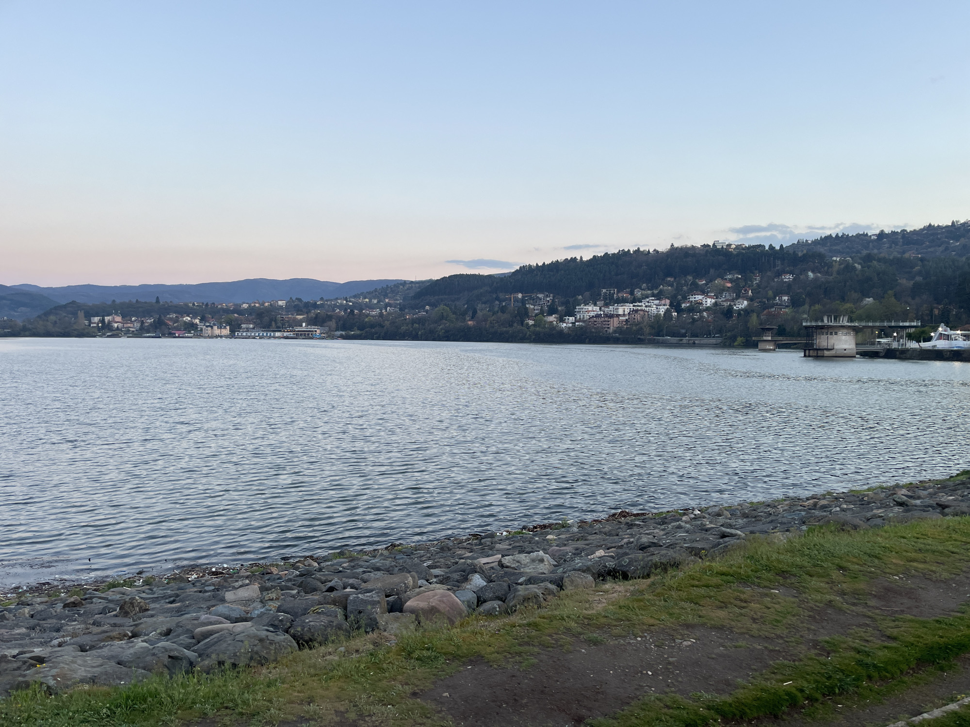The image depicts a wide expanse of water, likely a lake, with a shoreline in the foreground composed of large, dark rocks and grassy vegetation. Beyond the water, a landscape featuring a city or town stretches along the base of forested hills. Buildings, mostly white or light-colored, are visible amidst the trees, with a few taller structures standing out. To the right of the frame, there is a concrete structure extending into the water. The sky is pale blue, suggesting dawn or dusk. The lighting is soft and even, with no strong shadows. Based on the location mentioned, this image likely depicts a scene around German, Bulgaria, possibly featuring a view of a nearby lake or reservoir and the surrounding urban and natural landscape.