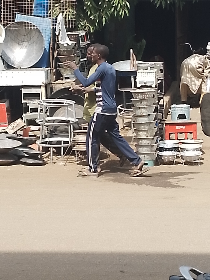 This outdoor market scene in Kofar Mazugal, Nigeria, is depicted under bright daylight with shadows cast on the unpaved, light brown ground. In the central foreground, a male walks from right to left, wearing a dark blue long-sleeved shirt with light horizontal stripes on the left torso, dark blue track pants with white side stripes, and light-colored flip-flops. He has short, dark hair. His right arm is extended forward and slightly upward, while his left arm is bent. Behind him, a second male is partially visible, wearing a light-colored short-sleeved shirt. The background features various market goods. On the left, a large, round, shallow metal basin rests on an elevated white structure, surrounded by stacks of smaller metal pans and metal frame structures, including a three-tiered empty stand. Towards the center-right, a tall stack of numerous identical metal bowls or sieves is supported by a metal frame, topped by a small white rectangular object. To its immediate right, another shorter stack of similar bowls rests on a light blue plastic crate, with a red plastic crate on the ground nearby. On the far right, a figure draped in light-colored fabric is partially visible, with bicycle components faintly discernible behind it. Green foliage from overhead trees is visible at the top of the frame, and a dark, shaded opening suggests an adjacent structure.