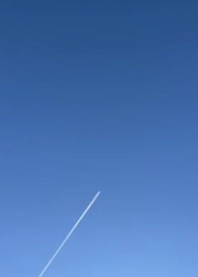 bright blue sky with a white contrail left by an airplane. A dog is barking loudly.