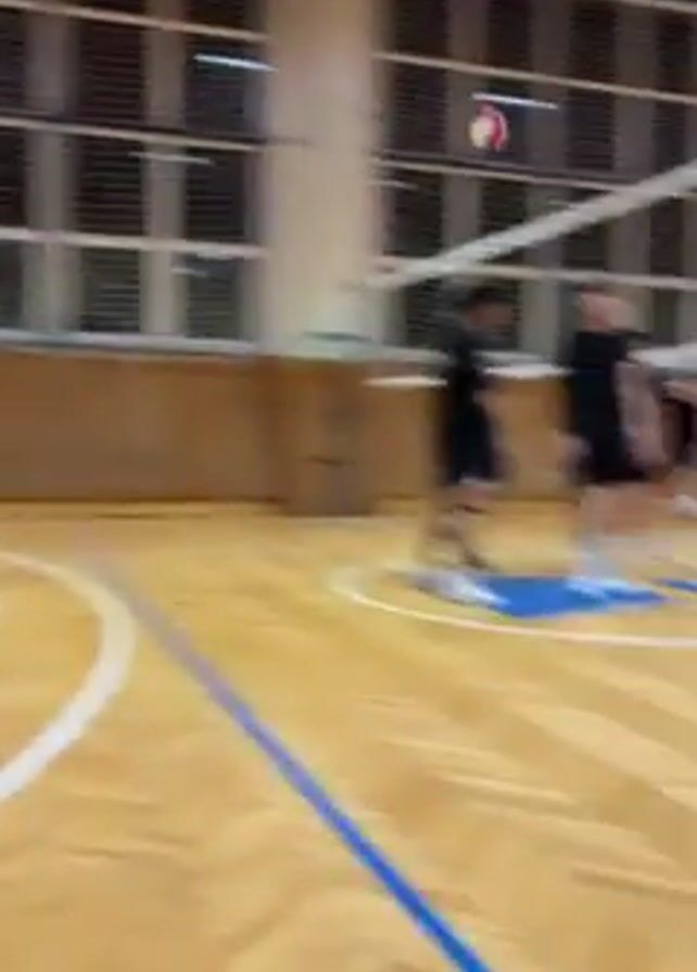 In a gymnasium with a wooden floor, a volleyball game is in progress. Several young men dressed in athletic wear are actively involved in the game. A net divides the court, and the players are positioned on either side. The video captures the dynamic movements of the players as they volley the ball back and forth. In the background, there's a basketball hoop and a wall lined with windows.