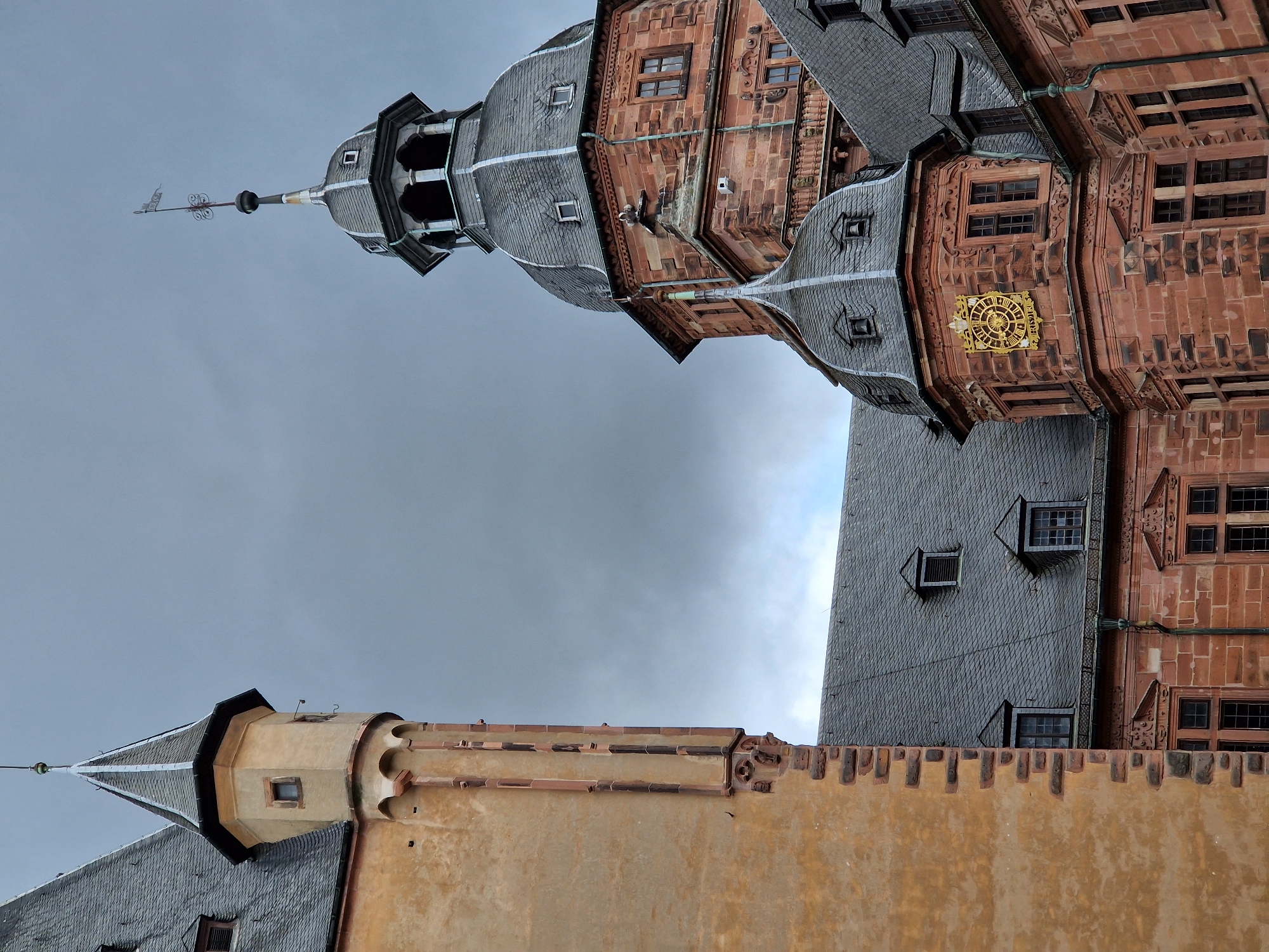 The image displays an architectural view of a historic building in Aschaffenburg, Germany, under an overcast sky. The scene is dominated by two distinct sections of a large structure. On the left, a tall, slender, round tower or turret features a faded yellow-ochre plastered exterior. Its upper portion culminates in a dark grey conical slate roof, beneath which a small, rectangular window is visible. The right edge of this tower exhibits decorative vertical reddish-brown stone elements with carved detailing near its base, transitioning to a dark grey slate roof of an adjacent building section. The right side of the image showcases a prominent section of a building constructed from reddish-brown sandstone blocks. A large, multi-tiered dome-shaped slate roof crowns a central tower, topped by a finial featuring ornate scrollwork and a small, pennant-like banner. Below the dome is an open belfry or observation level with arched openings. Further down, multiple rectangular windows with dark frames are set into the sandstone facade, which is adorned with intricate stone carvings and cornices. A golden, ornate shield or clock-like emblem, displaying radial lines and the inscription "1619" with an additional character, is mounted on a corner turret of this sandstone structure. Dark grey slate roofs with dormer windows are visible across various sections of the building. Greenish patina is present on some metallic architectural elements, suggesting copper. The sky is a uniform, heavy grey, indicating overcast conditions. No people, animals, or active interactions are present in the frame.