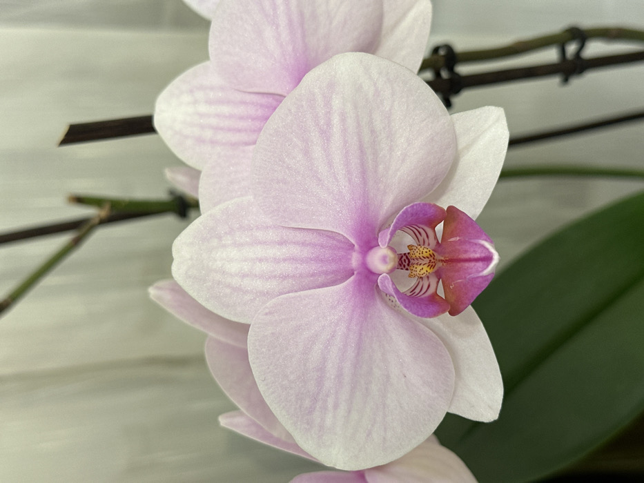 A vertically oriented close-up photograph depicts a blooming Phalaenopsis orchid. The central orchid flower is in sharp focus, exhibiting five broad petals and sepals, predominantly white with distinct pale pink to light purple vertical striations and venation. The prominent labellum (lip) is a vivid fuchsia or deep pink, with intricate internal yellow and orange patterns at its throat. Multiple other out-of-focus orchid blooms are visible in the background, to the left and right of the central flower. A segment of a deep green orchid leaf is visible in the lower left foreground. Dark brown or green orchid stems and slender support stakes are discernible in the blurred upper background. The overall background is a soft, out-of-focus, light-colored expanse, indicative of an indoor setting, possibly a wall or curtain. No individuals or other specific objects are present. The image contains no discernible visual cues to identify a specific location within the city of Varna, Bulgaria.