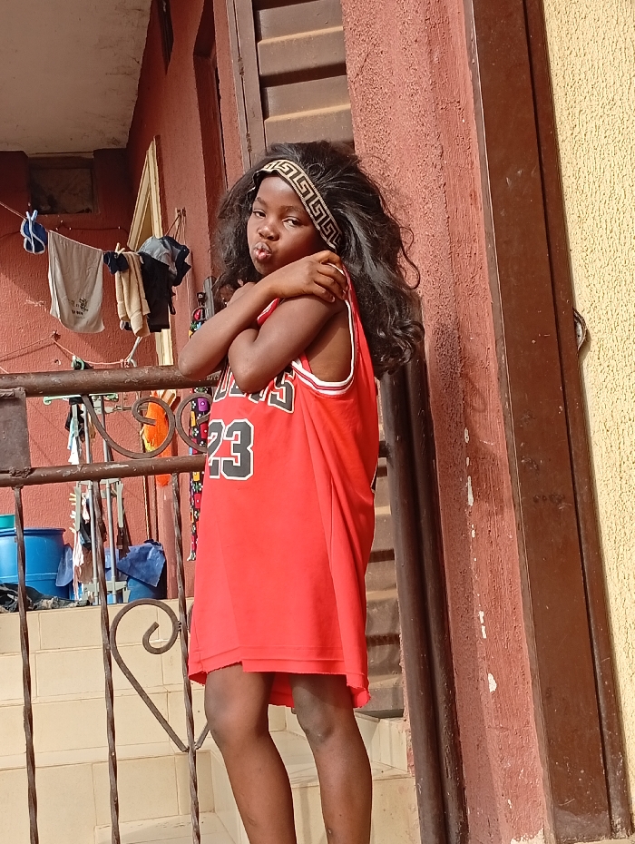 A young girl with long, dark, curly hair and a patterned headband poses outdoors. She wears a red basketball jersey with the number 23 on it. She has her arms crossed, looks at the camera, and puckers her lips. In the background, there is a railing, a building with red and yellow walls, and laundry hanging on a line.