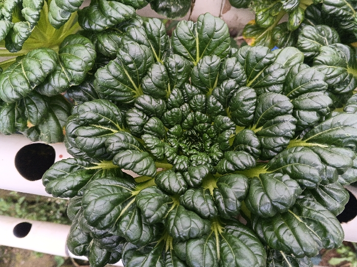 An overhead close-up captures a single, dark green Tatsoi plant (Brassica rapa subsp. narinosa) cultivated within a hydroponic system. The plant presents a dense, rosette growth pattern, characterized by numerous, heavily crinkled, spatulate leaves arranged in a tight spiral from a central point. Visible along the left and bottom edges are sections of white PVC pipe, featuring circular planting holes, indicating the hydroponic infrastructure. The background is blurred, suggesting an outdoor or greenhouse cultivation environment. No human subjects, objects other than the plant and pipes, or specific actions/interactions are present in the frame. This scene is located in Ho Chi Minh City, Vietnam.