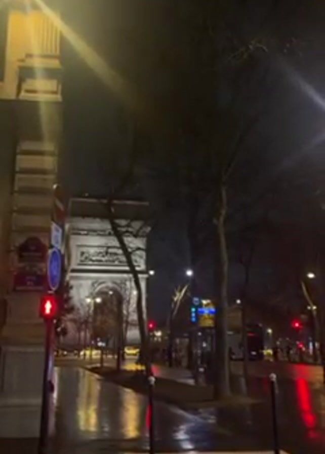 The video depicts a nighttime street scene in Paris, France. The Arc de Triomphe is visible in the distance. The street and sidewalk are wet, likely from rain. Streetlights cast a glow on the wet surfaces. A person pulling a red shopping trolley crosses the crosswalk. Bare trees line the street. A traffic light glows red. Several street signs are mounted on a pole to the left.