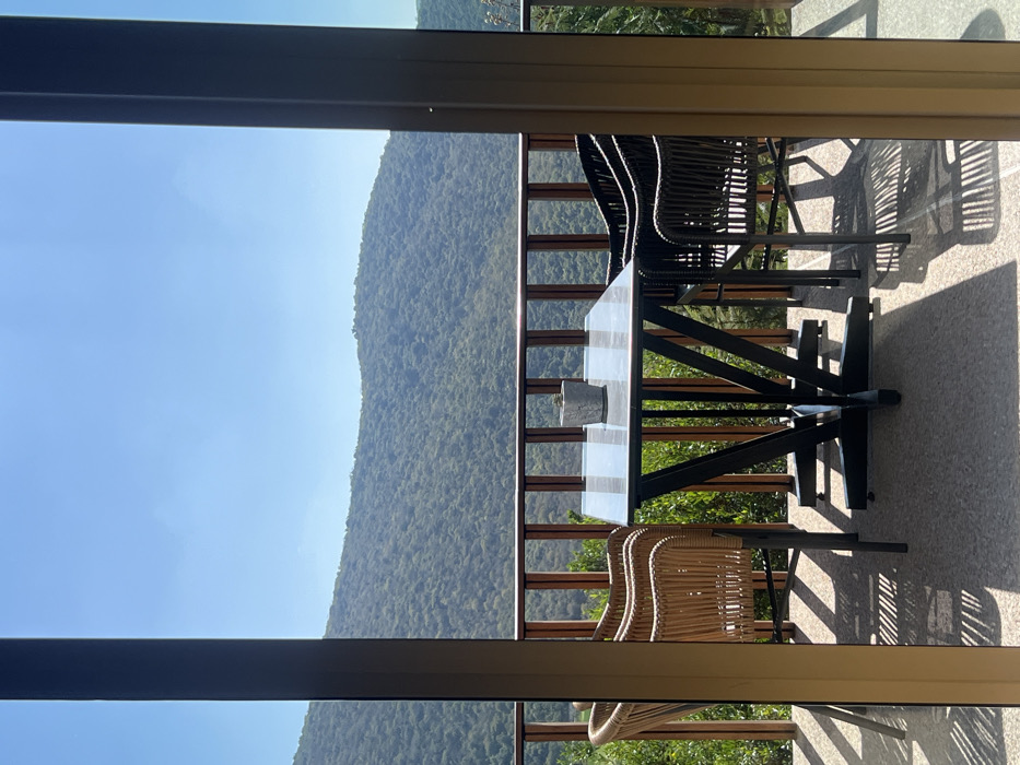 A patio view through a window features a table and chairs. The table, with a light-colored top and dark metal base, sits near a wooden railing. Two chairs are visible, one with a woven design and the other dark. Shadows from the furniture are cast on the patio. Beyond the railing, a mountain covered in lush green trees is visible under a clear blue sky. The window frame partially obscures the view on the left and right edges.
