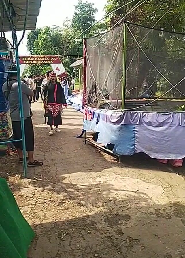 The video depicts two people dressed in traditional Indonesian clothing, specifically batik-patterned garments. They are holding swords and performing a ceremonial dance. A group of people, possibly part of the performance, are visible in the background. The scene is outdoors, with trees and a tent-like structure providing shade. The ground is a mix of concrete and dirt. A light fixture is visible in the foreground, attached to an unseen structure.