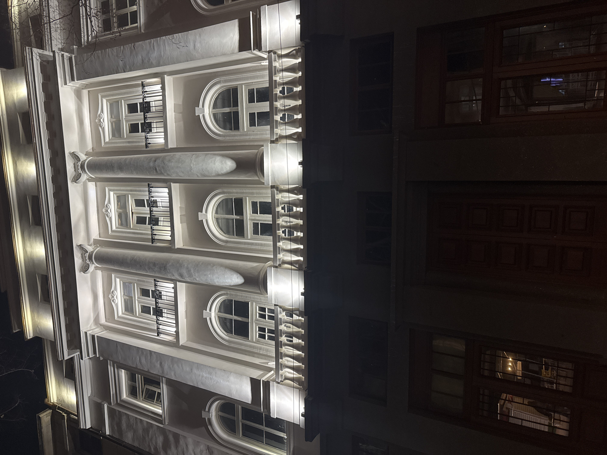 The image depicts the illuminated facade of a multi-story building at night in Kyustendil, Bulgaria. The structure exhibits neoclassical architectural elements. The upper levels are primarily a muted beige or light grey, rendered lighter by upwards-projecting white lights. The second floor from the top features five rectangular windows with white frames, symmetrically spaced. The leftmost window pane is partially open. The third floor from the top is characterized by four prominent fluted columns with Ionic capitals. Between these columns are three sets of double-door windows, each fronted by a small black wrought-iron balcony railing. To the far right, an additional rectangular window matches the style of the floor above. This level is extensively lit by white up-lights positioned at its base and top. Below this, the first floor above ground level features a continuous white balustrade, also illuminated by multiple up-lights. Behind the balustrade are three arched windows with white frames. The ground floor is considerably darker. On the left, a large dark wooden-framed window or glass door allows visibility into an interior space, revealing warm yellow ambient lighting and indistinct furniture. To the right of the ground floor center, a large, dark wooden door with rectangular paneling is visible. The immediate base of the building is a darker shade of grey or beige. No individuals are clearly discernible in the scene. The sky above is dark, indicating nighttime.