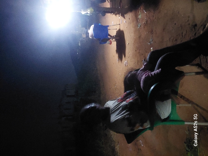 A dimly lit outdoor scene shows a person sitting in a green chair. A child is nestled in their lap. The ground appears to be dirt or sand, and a bright light source is visible in the distance. A blue object is also visible further away. The overall atmosphere is dark and possibly nighttime.