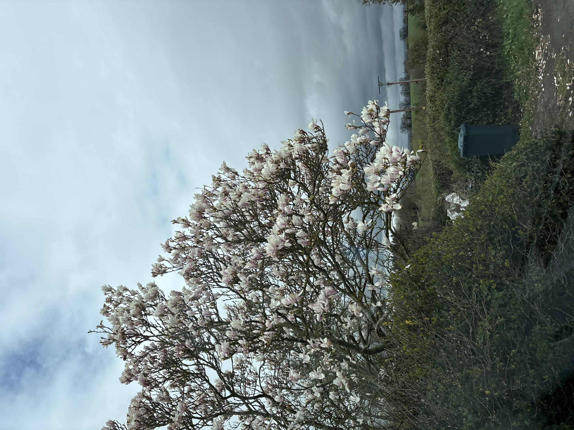 The scene depicts a rural roadside in Pulverbatch, United Kingdom, under a cloudy, overcast sky. A large magnolia tree, covered in numerous white and pale pink blossoms, occupies the left and upper portions of the frame. Below the tree, and extending to the right, are dense green hedges and shrubbery. A dark green wheelie bin is positioned on the right side of the image, resting against a hedge. White refuse, appearing as plastic bags, is visible near the bin and partially obscured by the hedge. The ground in the foreground features a dirt or gravel verge with scattered white petals. In the background, beyond the hedges, green fields are visible, interspersed with bare deciduous trees and utility poles with power lines. A faint white structure is discernible on the distant left horizon. No individuals or animate subjects are present.