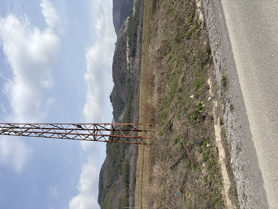 An outdoor scene in Mirkovo, Bulgaria, is captured under a partly cloudy sky. A tall, rusty brown metal lattice utility tower stands prominently in the left midground. The immediate foreground shows a gray asphalt road, bordered by a gravel shoulder and an elevated embankment of dry, light-brown grass, sparse green weeds, and a small piece of teal-colored refuse. Beyond the embankment, a flat agricultural field of dry, yellowish-brown vegetation, interspersed with reddish-brown shrubs, extends into the midground. Multiple power lines emanate horizontally from the top of the main tower, and additional wooden utility poles are visible in the distant field. The background features rolling hills densely covered with dark green coniferous trees and some bare deciduous trees. A distinct lighter-colored, possibly eroded or rocky, section is visible on a central hill. The sky is light blue with scattered white cumulus clouds. No individuals or discernible actions are present.