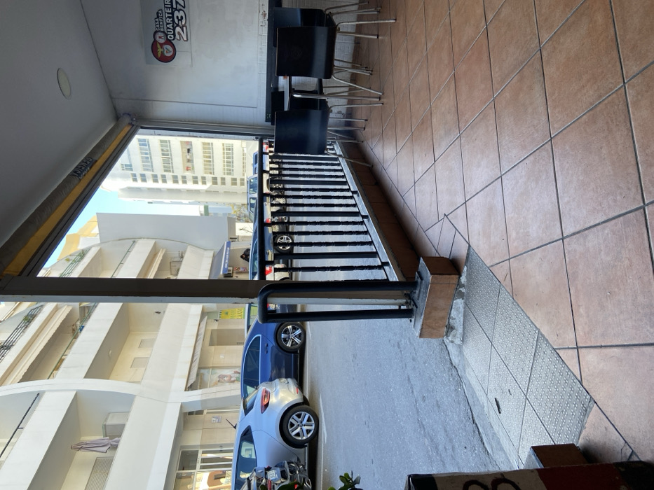 The image depicts an urban street scene in Quarteira, Portugal, viewed from an interior or covered exterior patio area