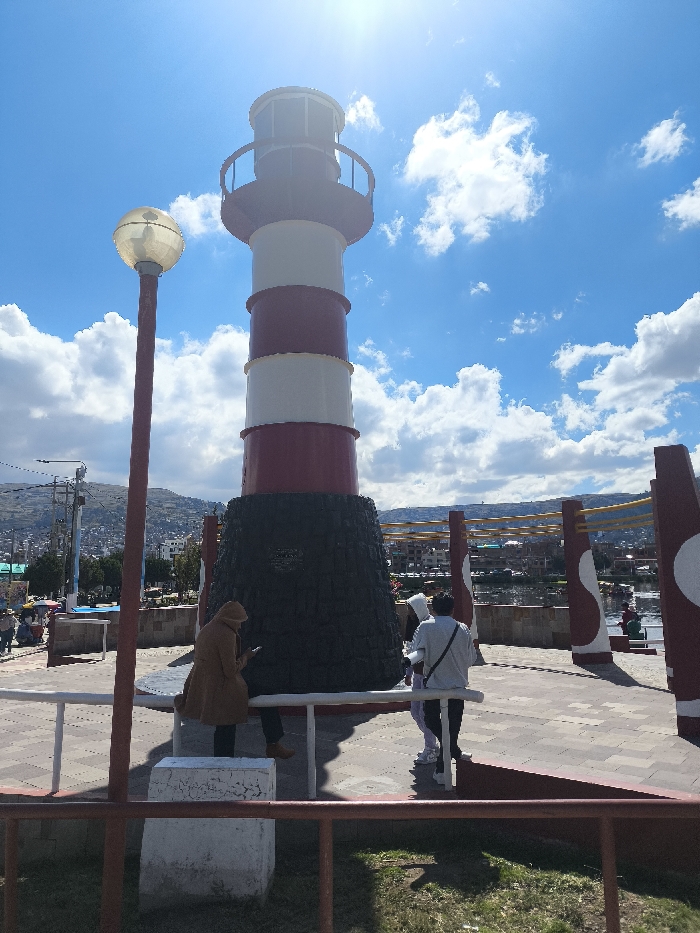 A lighthouse replica stands prominently on a paved plaza under a sunny sky with scattered clouds. The structure has a black base and red and white striped midsection, topped with a white cylindrical enclosure. A vintage-style street lamp is to the left. A few people are gathered around the lighthouse, one looking at a phone. The scene is bordered by red painted railings. Distant hills and buildings create a scenic backdrop.