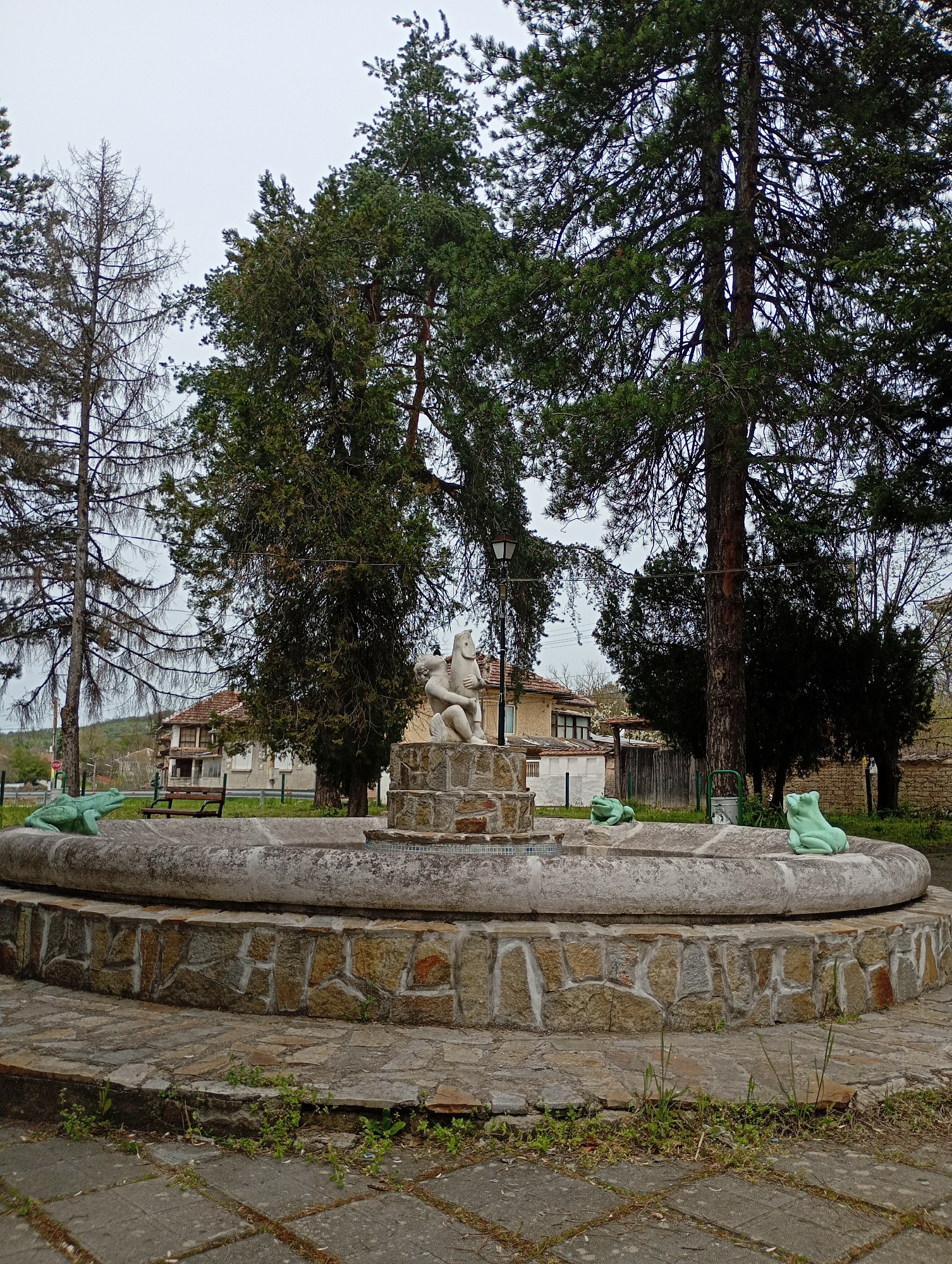 The image depicts a circular stone fountain located in Gorsko Novo Selo, Bulgaria. The fountain has a stone base, a raised central tier with a statue of a person holding what appears to be a fish, and a circular basin around the statue. Three green frog statues are placed around the fountain's rim. The fountain is surrounded by trees, including deciduous and evergreen varieties. In the background, there are houses and a bench. The ground around the fountain is paved with stone tiles. The sky appears overcast.