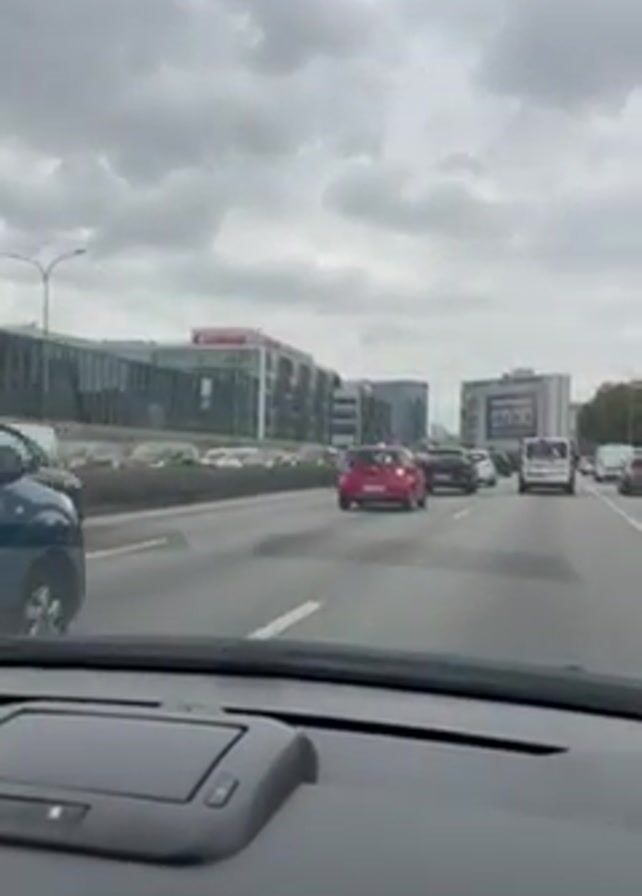 view from inside a car, looking out onto a highway. There is traffic moving slowly, and a police car with its lights flashing is visible. Buildings line the side of the highway. The sky is cloudy.