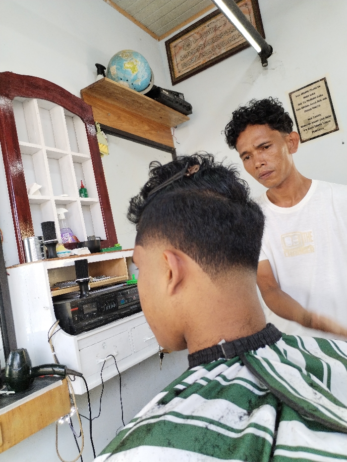 The image captures an indoor scene within a barbershop located in Mns Alue, Indonesia