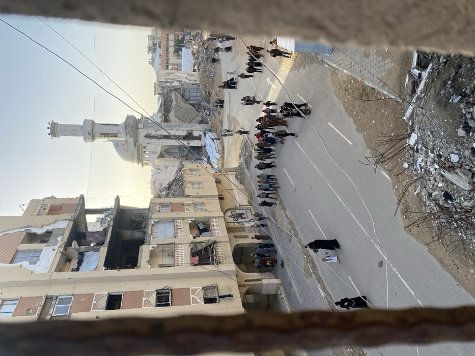 The image depicts a devastated urban street scene in Khan Yunis, Palestinian Territory, viewed from an elevated vantage point