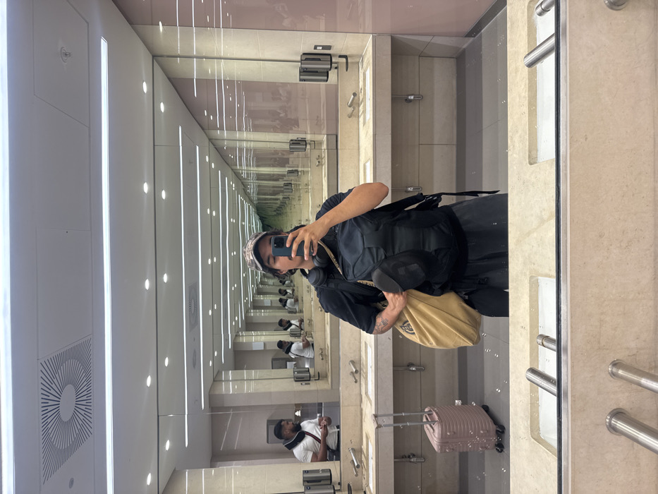 The image displays a mirror selfie captured within a modern public restroom, situated in an airport or large facility in Al Matar, United Arab Emirates