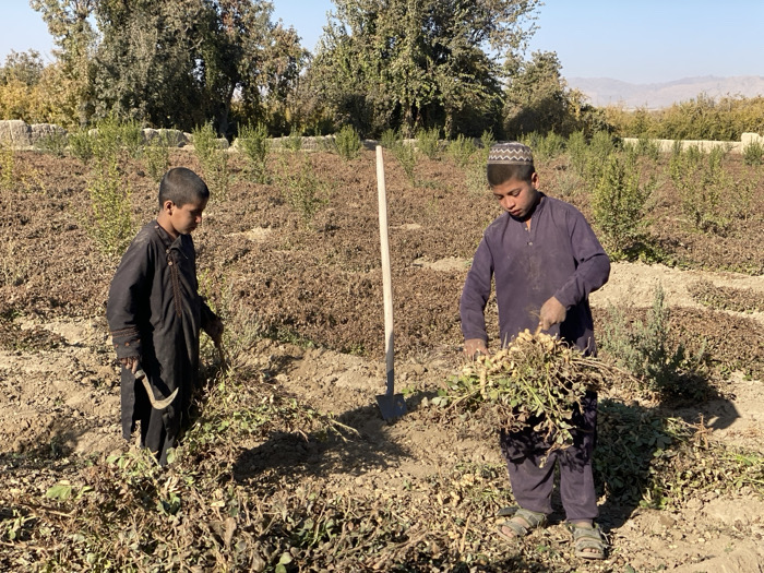 Two young boys stand in a field, likely harvesting crops. The boy on the left wears a dark robe and uses a small, curved blade. The boy on the right, also in dark clothing and wearing a cap, holds a bundle of harvested plants with peanuts attached. A hoe rests in the background. The field is covered in rows of low-lying crops, with trees and a low wall visible in the distance under a clear, daytime sky. The image conveys a scene of rural labor.