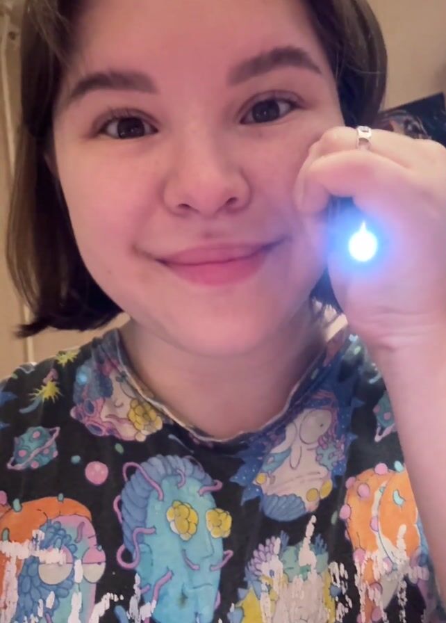 A woman with short brown hair and a colorful T-shirt holds a small silver flashlight to her face