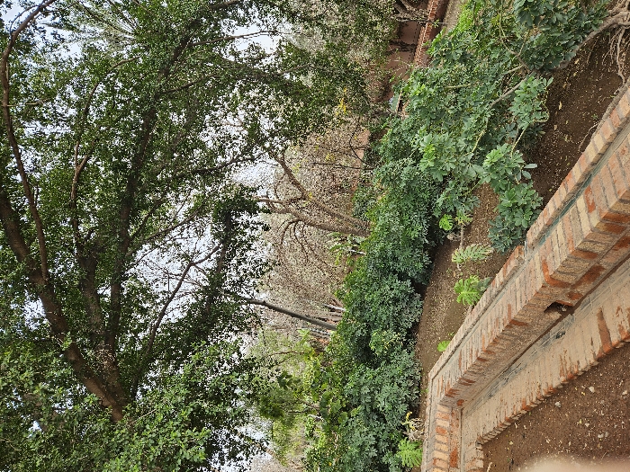 The image depicts a cultivated garden landscape, characteristic of the Menara Gardens or Agdal Gardens in Marrakesh, Morocco. In the foreground, a brick-lined irrigation channel, known locally as a *seguia*, runs diagonally from the lower left to the middle right. This channel comprises two parallel walls constructed from reddish-brown bricks, forming a trough with an earthen base containing fine sediment. The immediate ground around the *seguia* is exposed light brown earth. Beyond the irrigation channel, a gently sloping terrain is covered with a variety of green bushes and low-lying plants, exhibiting diverse leaf shapes and densities. The ground beneath this vegetation is darker brown earth. The upper portion of the scene is dominated by a dense canopy of large, mature trees featuring abundant green foliage and thick, gnarled branches. In the mid-background, additional trees with sparser leaves and some bare branches are visible, suggesting a mix of tree species or seasonal variation. The sky above is light, indicating daylight conditions. No individuals, animals, or specific human actions are observed within the frame.