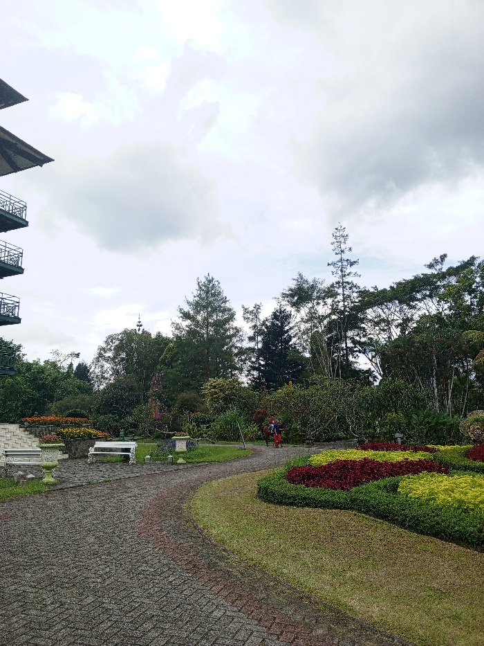 A winding cobblestone path curves through a garden under a cloudy sky