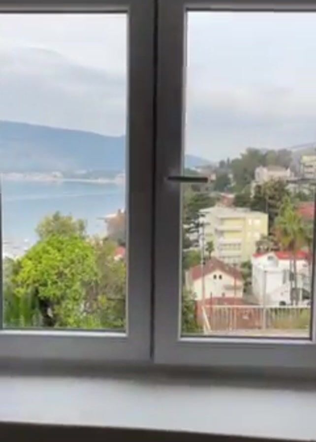 view from inside a room through a closed double-paned window. The window is white framed. A hand reaches forward and opens the right side of the window. The view through the window reveals a coastal town with buildings, trees, and a body of water in the background, framed by mountains. The sky is overcast.