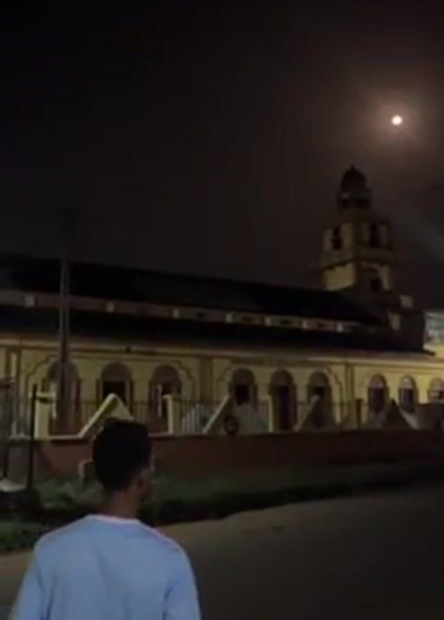 A man in a light blue shirt walks on a street toward a church at night. The church is yellow and brown with a tall tower, illuminated by lights. Above the church, the moon shines in the dark sky. A streetlight illuminates the street in front of the church. There are electrical wires visible in the sky. The video is taken from a low angle, following the man as he walks.
