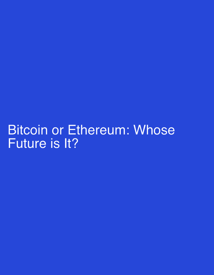 The image displays a solid blue background. White sans-serif text is centered on the lower-left quadrant, reading: "Bitcoin or Ethereum: Whose Future is It?". No individuals, other subjects, physical objects, actions, or interactions are visible. The environment depicted is solely a digital or graphic display. There is no visual information within the image to determine a specific geographical location, including Samarkand City, Uzbekistan.