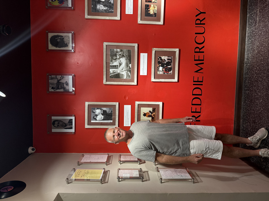 The scene is an interior view of the Freddie Mercury Museum in Stone Town, Zanzibar City, Tanzania