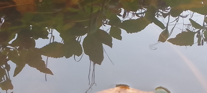 This image presents a close-up, low-angle view of a calm water surface within the city of Unknown, Unknown. The upper half of the frame displays an inverted reflection of overhead foliage, consisting of dark green leaves of various shapes, some with serrated margins, and multiple slender tendrils against a hazy, light-toned background. The lower half shows the actual water surface, which appears tranquil and reflective, predominantly light gray with a prominent, diffuse bright streak angled from the upper right toward the lower center. An irregularly shaped, light tan object, consistent with a piece of bark or organic debris, is positioned on the water's surface. A small, yellowish-brown arthropod, possibly an insect, is observable at rest upon this floating object. A partial view of a second, greenish object is visible on the far right edge of the floating material.