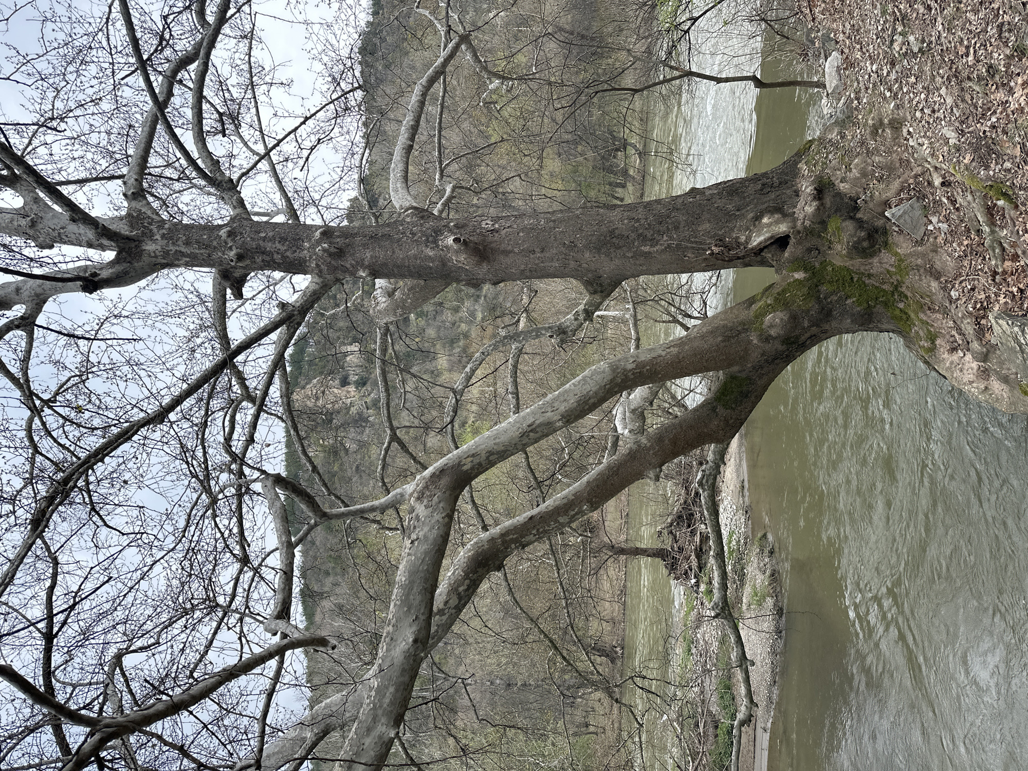 The photograph captures a scene along the Struma River in Stara Kresna, Bulgaria. A large, mature tree, likely a sycamore or plane tree, dominates the foreground. Its thick trunk is partially covered in moss where it meets the riverbank, which is littered with leaves and small stones. The tree's branches, bare of leaves, reach across the frame, partially obscuring a view of the river and the wooded landscape on the opposite bank. The river is flowing, with visible ripples on its surface. The sky is overcast, contributing to the muted color palette of the scene. No people or animals are visible.