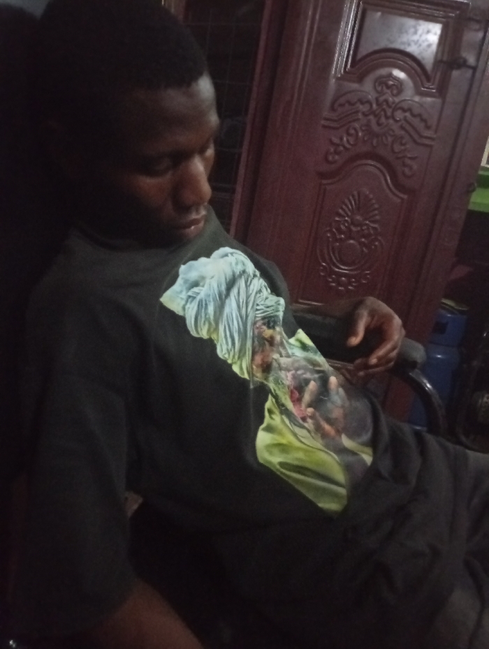 The scene is an interior location in Obosi, Nigeria, dimly lit. A single Black male is seated, positioned with his body angled slightly to the left, and his head tilted downwards and to his right. He has short, dark hair. He wears a dark, short-sleeved t-shirt with a prominent graphic on the chest, depicting a figure with a white headwrap and intricate imagery including hands and abstract forms in shades of green, brown, and dark red/purple. Dark trousers are also visible. Behind the individual, a dark brown door with ornate, carved patterns is present. The dark armrest of a chair is partially visible on the right side of the frame.