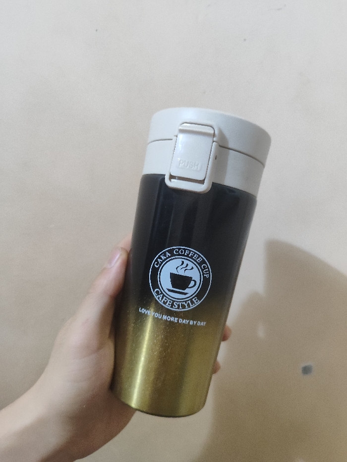 A person holds a CAKA coffee cup in hand. The cup has a two-toned finish, transitioning from black at the top to gold at the bottom. A white lid with a "PUSH" button is on top. The cup features a logo with a steaming cup of coffee inside a circular border that reads "CAKA COFFEE CUP CAFE STYLE." Below the logo, text reads "LOVE YOU MORE DAY BY DAY." The background is a plain wall.