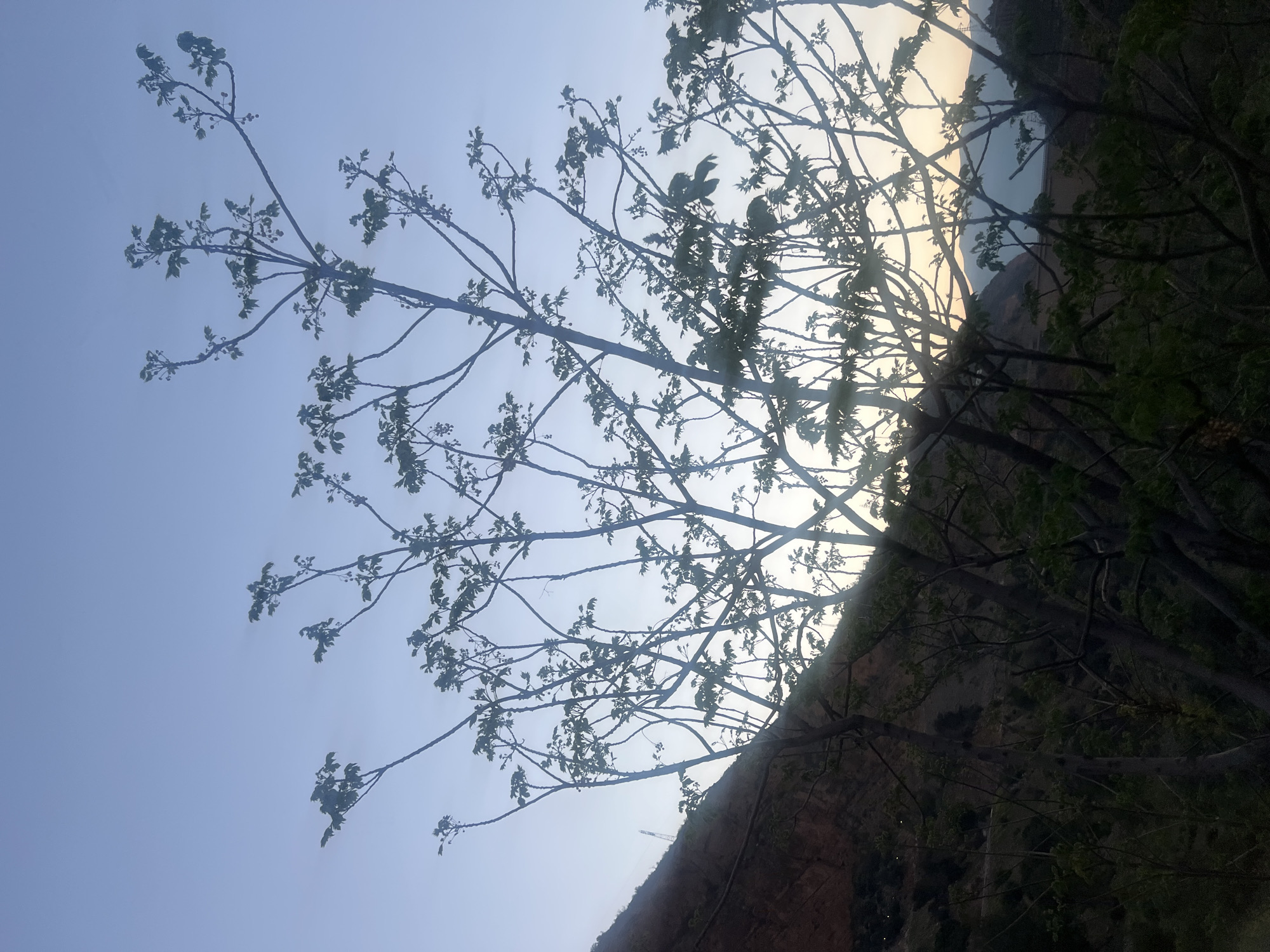 The image depicts a tree silhouetted against a bright sky, presumably near sunrise or sunset. The tree, which is situated in a mountainous area near Bin El Ouidane, Morocco, has thin branches with small leaves. The sky is a pale blue with a gradient towards the horizon where the light is brighter. The background shows a hillside covered with trees and vegetation.
