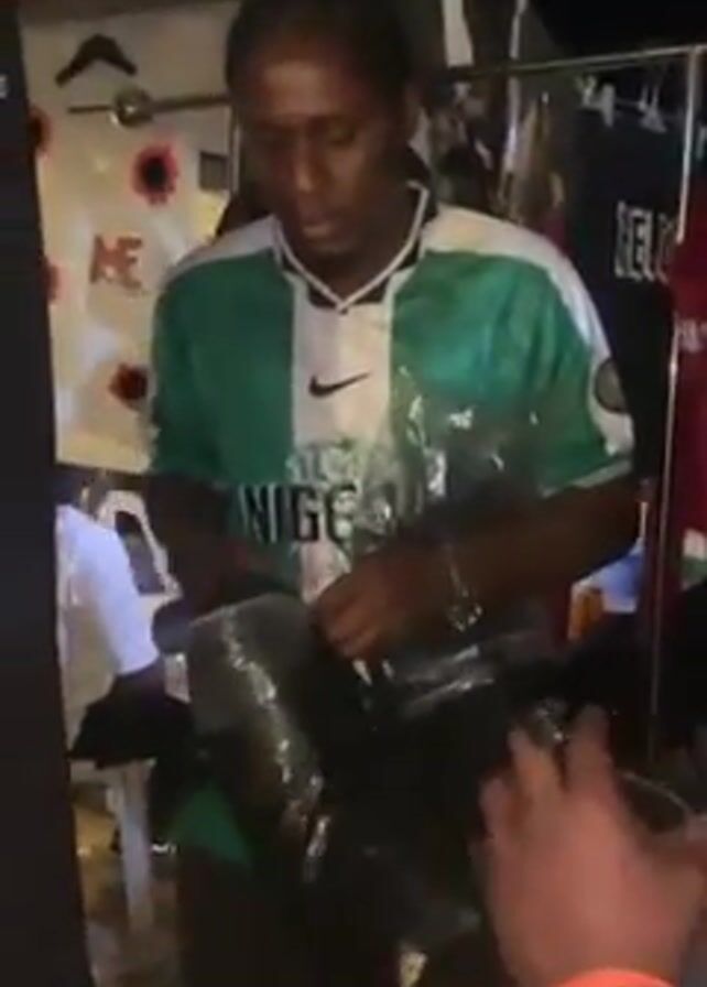 A man in a green and white Nigeria soccer jersey struggles to open a black plastic bag