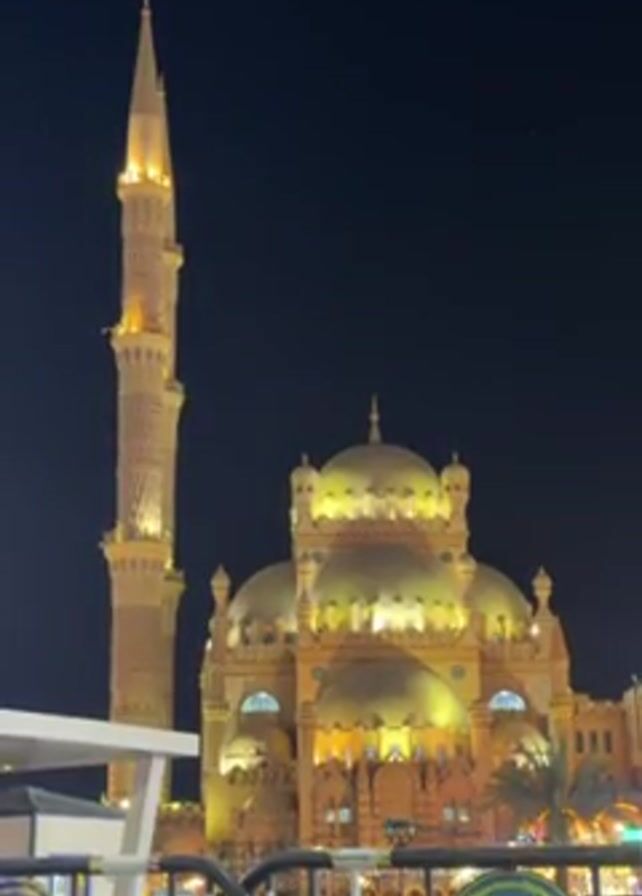 large, ornate mosque at night. The mosque is lit up with yellow lights, and it has a tall minaret to the left and a series of domes at the center. The sky is dark and clear. There is a security barrier in the foreground with an emblem on it. The sound of a prayer call can be heard.