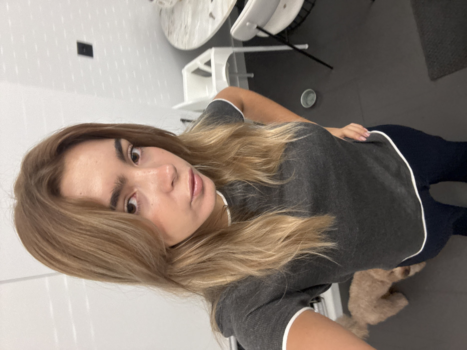 A young woman with light brown hair and a gray top looks directly at the camera. She is indoors, with a white highchair and a round table visible in the background. Part of a small, tan dog is visible at the bottom of the frame. The room features a light-colored wall and a darker floor, with a dark gray rug.