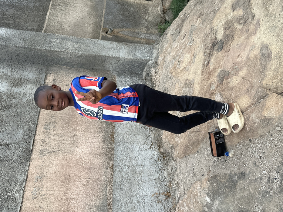 A young boy in a red, white, and blue jersey, black pants, and light-colored slides poses on a rock and concrete surface. He flashes a peace sign. A black object sits near his feet on the rocky surface. The background features a textured concrete wall and some green vegetation.