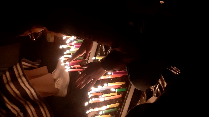 In a dark setting, numerous colorful, lit candles rest on a surface. A pair of hands reach over the candles. To the left, a striped blanket and tan-colored shoes are present. The scene is dimly lit by the glow of the candles. A person wearing a hat is to the right of the lit candles.