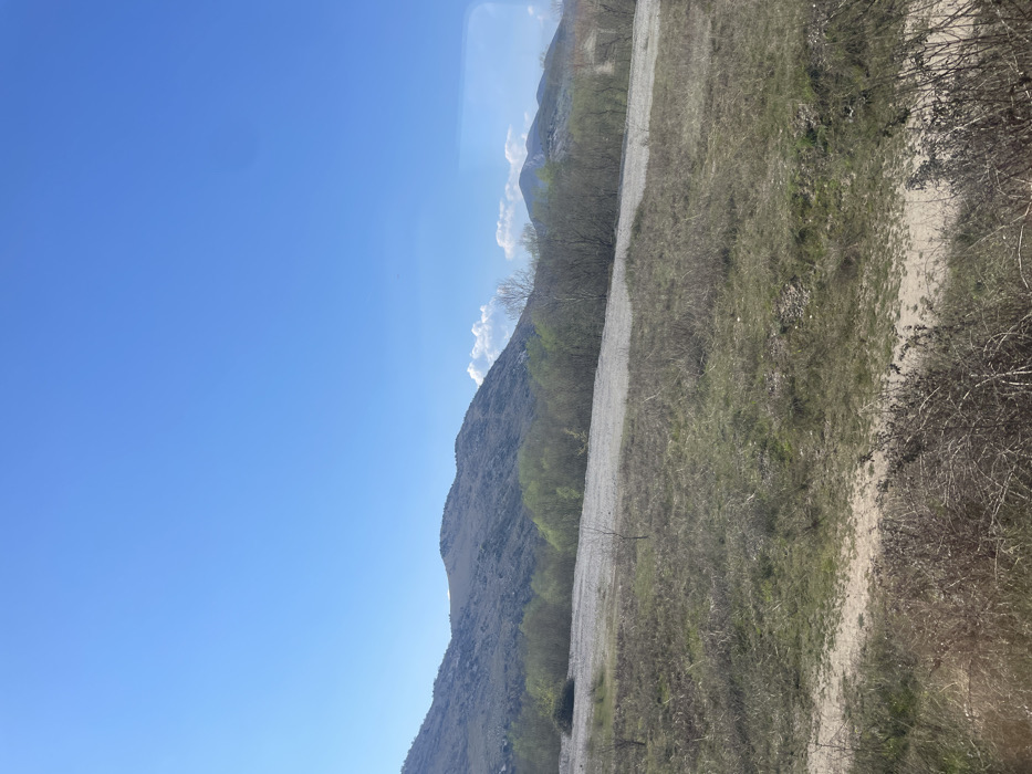 This image displays a rural landscape in Goričani, Montenegro, under a clear blue sky. The upper portion of the frame is dominated by an uninterrupted expanse of blue, with a few small white cumulus clouds visible along the distant horizon to the right. A range of rocky, sparsely vegetated hills forms the background, appearing light gray and brown. In the mid-ground, a band of deciduous trees shows varying stages of early spring growth, with some exhibiting light green foliage and others remaining bare. Immediately in front of this treeline, a broad, light-colored area of ground, consistent with bare earth or gravel, stretches across the scene. The foreground consists primarily of dry, light brown grasses and dormant, thorny shrubs. A light brown dirt path or track is visible in the lower-center and lower-right portions of the foreground. No human figures, animals, or artificial structures are present. The scene is illuminated by natural sunlight, suggesting a clear day.