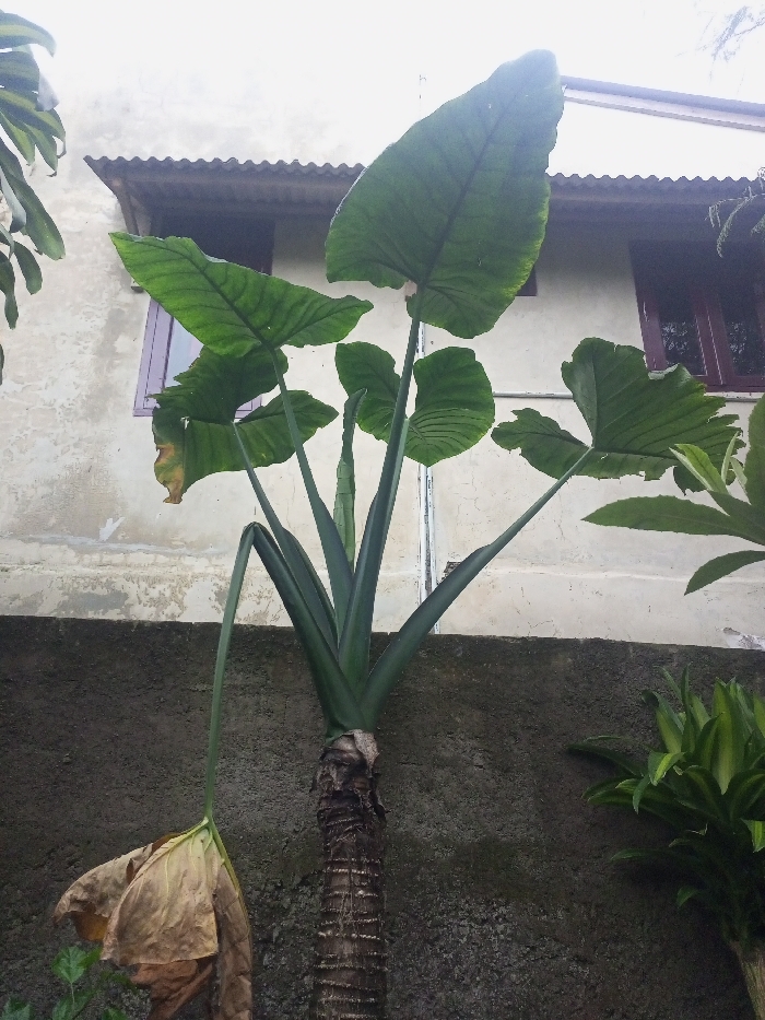 The image displays an outdoor scene in Bamhori, India, featuring a prominent large-leafed plant positioned in front of a concrete wall and a building. The central subject is a tall plant, likely an Alocasia or Colocasia, with a thick, ridged, dark brown trunk approximately 0.8 meters in height. Multiple sturdy green petioles extend upwards from the trunk, supporting several large, dark green, heart-shaped leaves that exhibit distinct venation. One elongated, slender petiole descends towards the lower left, culminating in a single, withered, light brown, curled leaf. To the lower right, a cluster of smaller green, leafy plants is partially visible. The plant stands against a grey, unpainted concrete wall with a coarse texture. Above this wall, a light-colored building with a textured facade is present. Two rectangular windows, featuring dark frames and a purple tint, are visible on the building. A dark, corrugated metal awning or roof overhang extends across the top of the visible building section. The sky is bright and overcast, suggesting daytime. No individuals or active subjects are depicted.