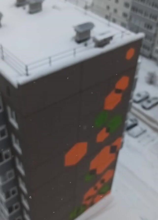 snowy day in an urban area. The camera focuses on the side of a tall apartment building with a flat, snow-covered roof. The building's facade is decorated with orange and green geometric shapes. Snow is falling lightly, and other buildings and parked cars are visible in the background. The scene is shot from a high angle, possibly from another building. There are no people visible in the frame.