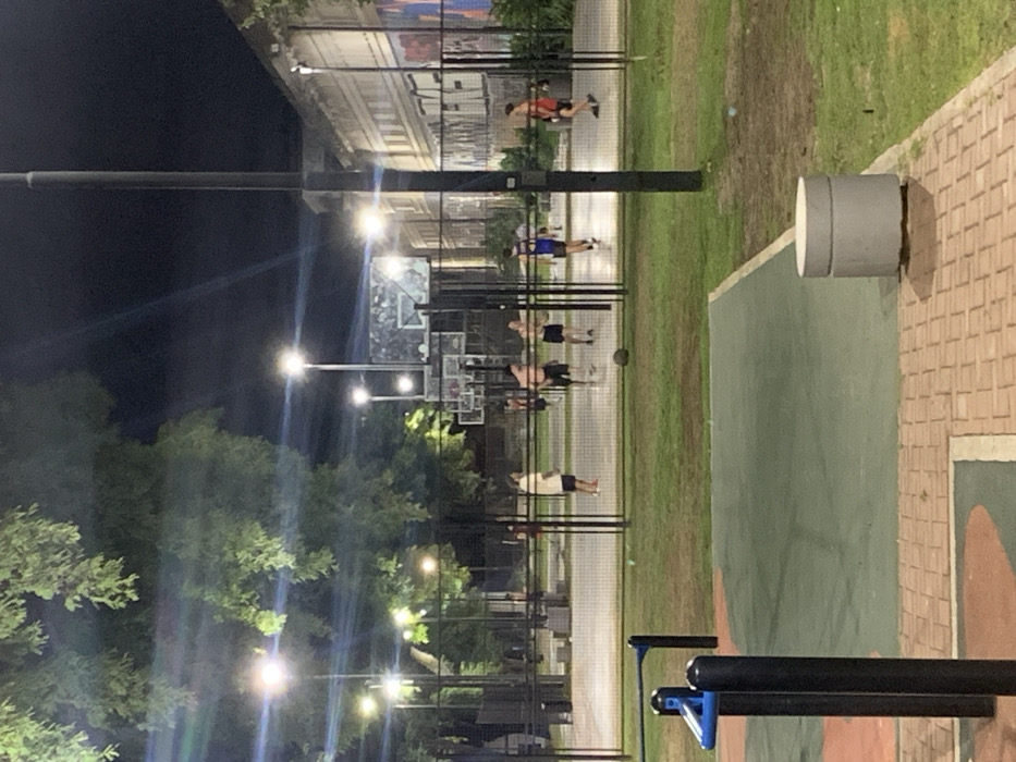 A night shot shows an outdoor basketball court with players. Streetlights illuminate the scene, casting bright light through trees. A building appears elevated above the court in the background. To the side is a park-like area with grass. The edges of the image include a brick path and fitness equipment.
