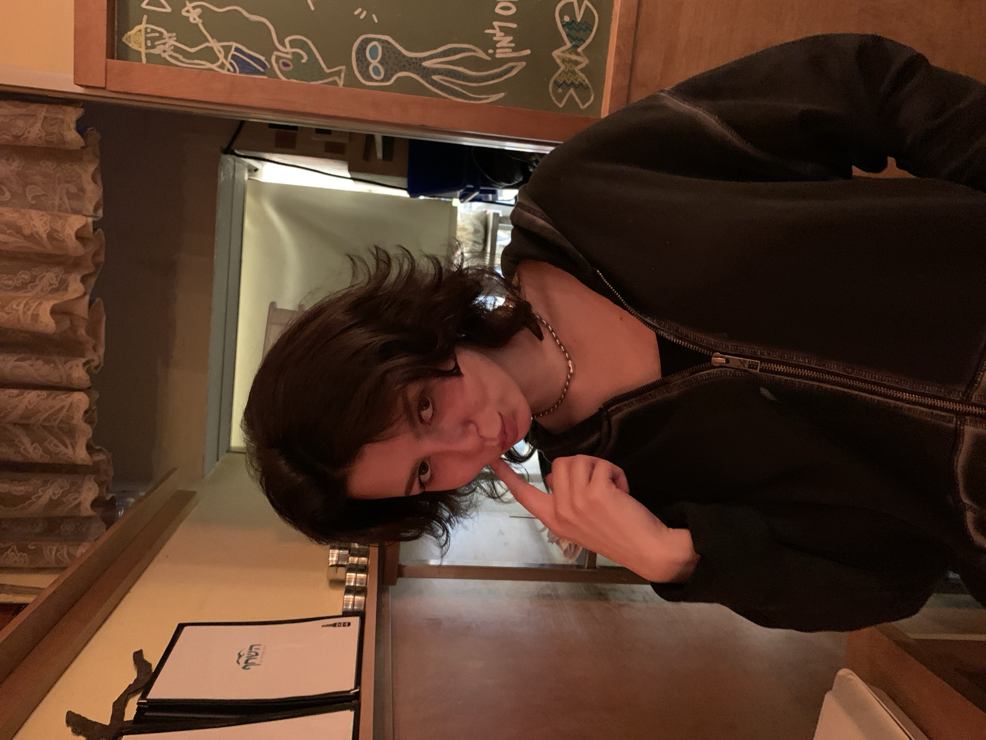 The scene depicts an interior setting, likely a restaurant or cafe in Tel-Aviv, Israel, as indicated by the Hebrew text on visible signage. A female subject with dark, shoulder-length hair occupies the center of the frame, looking directly at the camera. She wears a dark, possibly black or dark grey, zippered hoodie and a silver-colored chain necklace. Her right index finger is pressed against her right cheek, causing her lips to form a slight pout. To the left of the subject, several menus featuring Hebrew script, including the word "השתף," are displayed upright on a light-colored wooden shelf. Below these, a stack of small, metallic, cylindrical containers is visible, and a white styrofoam container rests on a lower shelf. To the right, a wooden-framed chalkboard displays white chalk drawings of a figure in a hat, an octopus, and two stylized fish, alongside partial Hebrew text. Above the subject, a patterned lace curtain hangs, and in the background, a brightly lit area is visible through an opening, revealing indistinct objects and a blue container. The overall lighting is warm and somewhat dim.