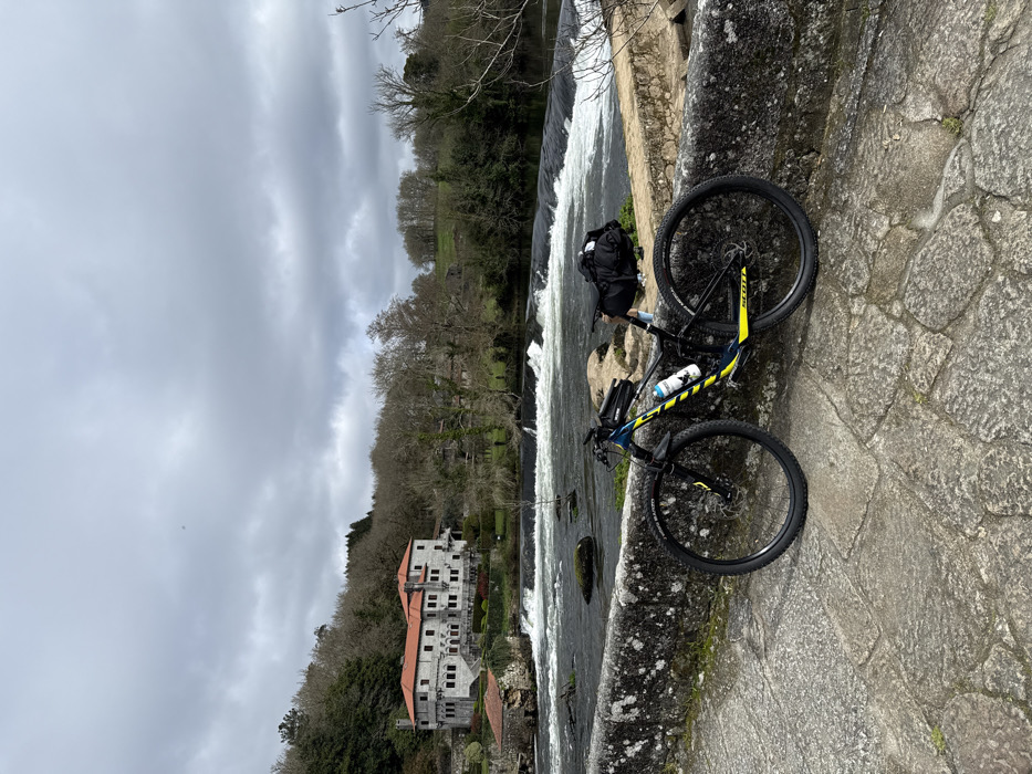 A Scott mountain bike, dark blue and black with prominent yellow accents, is positioned in the foreground, leaning against a weathered stone wall. The bike features disc brakes, a white water bottle in its frame cage, a small black top tube bag, and a larger black saddle bag. The stone wall, covered with patches of moss and lichen, forms the edge of a paved stone surface, likely part of a bridge or walkway. Beyond the wall, a river flows with visible white rapids and small weirs stretching across its width, indicating a swift current. Sparse rocks and some minimal vegetation are present within the river. On the opposite bank, a large, multi-story stone building with a distinctive red tiled roof and numerous windows is situated on a hillside. This building is characteristic of the architecture found in the city of A Ponte Maceira, Spain. The surrounding landscape consists of hillsides covered with deciduous trees, many appearing bare, suggesting a dormant season. The sky above is overcast with a uniform layer of grey clouds. No individuals are present in the scene.