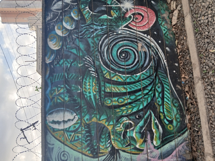 The image depicts a concrete wall approximately 1.8 meters high, extensively covered in a multi-colored graffiti mural. The artwork features a stylized, abstract face or mask-like figure with prominent eyes, intricate patterns resembling scales or tribal designs, and a large central spiral, primarily in shades of teal, dark green, and black, with accents of white, yellow, and pink. Along the top edge of the wall, six strands of razor wire (concertina wire) are secured, forming distinct loops against an overcast sky. Behind the razor wire, to the right, a partial white sign with dark lettering is visible, reading "KEE MULTI...". Further in the background, a tall, light-colored high-rise building is present on the right horizon, indicative of an urban environment. A small green plant sprouts above the wall near the center. At the base of the wall, a narrow strip of dark soil and grey gravel is visible, bordered by a light grey concrete curb approximately 10-15 cm wide. No people, specific actions, or interactions are present in the frame. The location is an urban setting in Nairobi, Kenya, likely along Koinange Street within the Central Business District, based on the visible partial sign ("KEE MULTI...") which corresponds to the "Kee Multi Business Centre" on Koinange Street, and the typical street art found in that area.