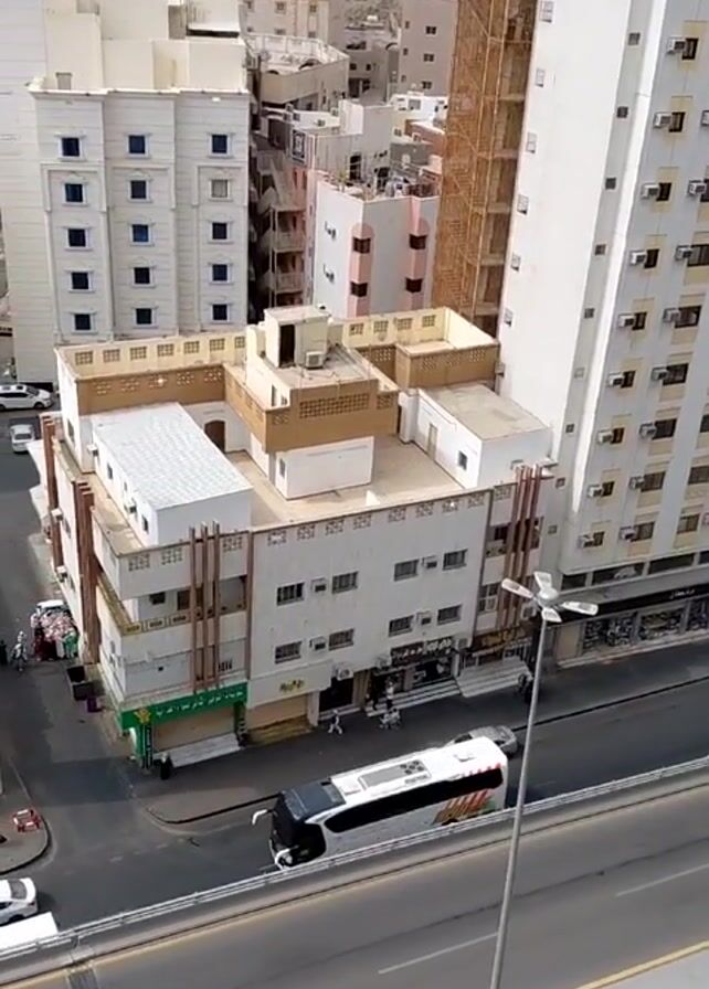 n urban environment with several tall buildings, most of which are white or light-colored. The buildings appear to be densely packed. A road runs in the foreground with a white bus parked on the side. Several cars are visible on the road and parked nearby. A light pole is near the road. A minaret stands on a side street leading from the main road. People can be seen walking on the sidewalks and near the minaret. A mountain is visible in the background, adding depth to the scene. The video is taken from a high angle, providing a comprehensive view of the surroundings.