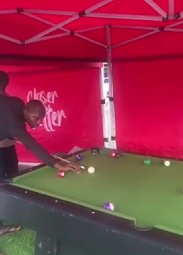 A man is playing pool under a red pop-up tent with the phrase "Closer is Better" written on it. The pool table is green with various colored balls scattered across it. The man, wearing a black long-sleeved shirt, leans over the table, aiming with his pool cue. He strikes the white cue ball, sending it towards another ball on the table. The camera follows the cue ball's trajectory, then pans back to show the other balls on the table. The environment appears to be outdoors, with artificial grass visible around the base of the pool table.