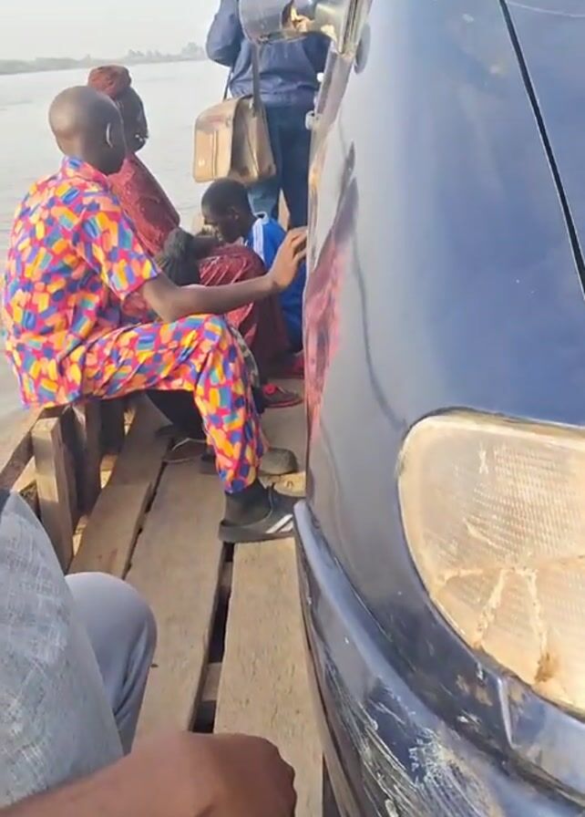 group of people on a wooden raft or ferry crossing a river. A blue car is parked on the raft, taking up a significant portion of the space. Some people are seated on the edges of the raft, close to the car. One person is wearing a colorful geometric patterned shirt and pants. Another man stands near the car with a satchel-like bag. The river stretches out to the horizon, with land visible in the distance. The day appears bright and clear.